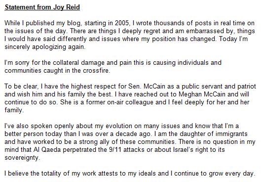 The host of far-left MSNBC’s “AM Joy” is apologizing for the second time in nearly a month after old posts surfaced in which Reid disparaged Sen. John McCain, questioned whether Al-Qaeda was behind the 9/11 attacks, and suggested that Israel should not be a sovereign nation.